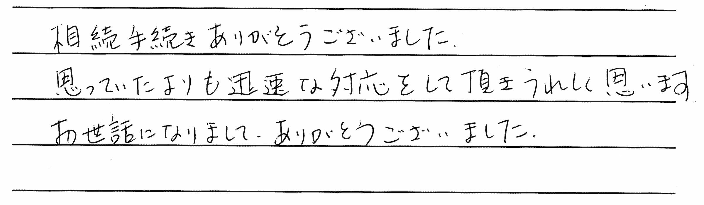 お客様の声 思っていたよりも迅速な対応をして頂きうれしく思います。 船橋市在住/女性 ご依頼の内容: 不動産の相続登記 相続手続きありがとうございました。 思っていたよりも迅速な対応をして頂きうれしく思います。 お世話になりまして、ありがとうございました。 「不動産の相続登記」サービスを詳しく見る 前の記事へ 一覧へ この記事のタグ 不動産の相続登記不動産登記相続の手続き 関連するお客様の声 【親族間売買の登記】的確で分かりやすい説明、迅速な対応、安心してお任せできました。 【不動産の相続登記】ウェブで探して、料金などを考慮して依頼しました。 【不動産の相続登記】細かく丁寧に話を聞いてくださり、ありがとうございました。 【抵当権の抹消登記】明朗会計で、依頼させていただいて良かったです。 【不動産の相続登記】相談に伺った折から丁寧に説明して下さりました。 【成年後見】入居後も連絡をもらい安心してお願い出来ました。 【親族間売買の登記】事前に費用や要する時間を説明いただき、安心してお任せできました。 【不動産の相続登記】足が悪いため自宅に来ての打ち合わせも問題なく受けてくれました。 【不動産の相続登記】ホームページがとても分かりやすくお願いしようと思いました。 【不動産の相続登記】素人の私にも分かりやすく説明頂き、気軽に何でも相談できました。 サービス別のお客様の声 不動産の売却代理不動産の相続登記不動産登記会社の設立会社・法人登記成年後見成年後見の申立抵当権の抹消相続おまかせパック相続の手続き預貯金の相続 まずはお気軽にご相談ください!